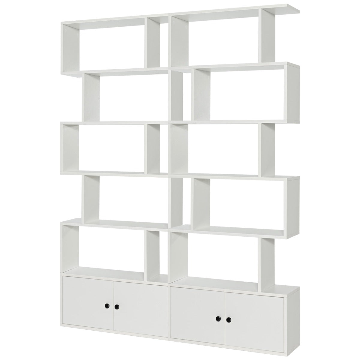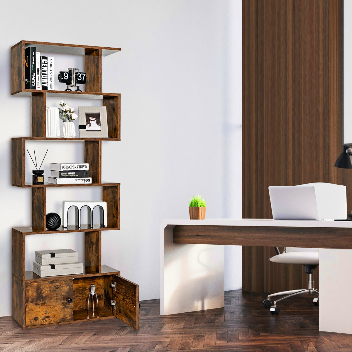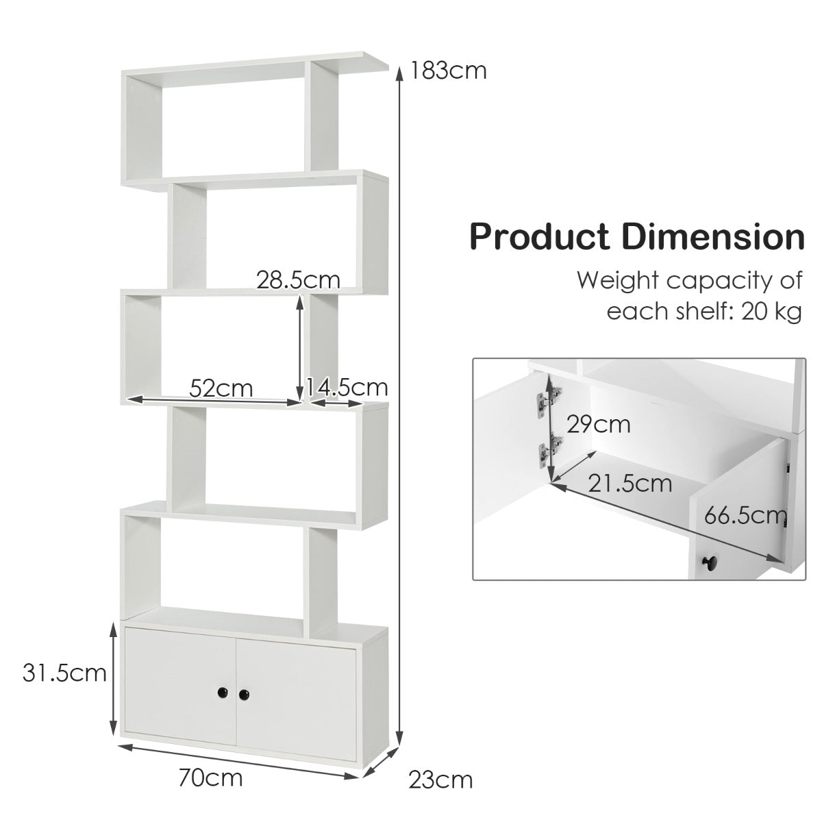 With a geometric design, our S-shaped bookshelf with cabinet will be a great addition to your space, suitable for the living room, bedroom and home office. 5 open shelves and a closed cabinet provide a large storage capacity for your home supplies, decorations, collections, plants and more. The double-door cabinet is equipped with door handles and premium hinges, offering smooth opening and closing for long-time use. The bottom has non-slip foot pads which can also protect the floor from scratching when you move the bookcase. Considering safety, this freestanding storage rack comes with 4 anti-toppling devices to fix it to the wall. The maintenance is convenient with a cloth. With detailed instructions, the assembly is quick.
