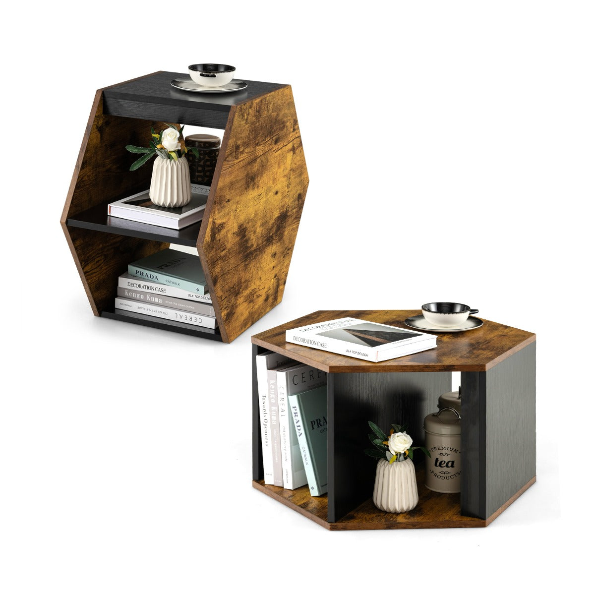 Roomy Storage Space: The middle storage shelf divides each hexagonal side table into 2 open storage parts for objects that are nor needed frequently. Likewise, the spacious tabletop will accommodate a cup of coffee, a laptop and some other items, allowing you to have access to them once you need.