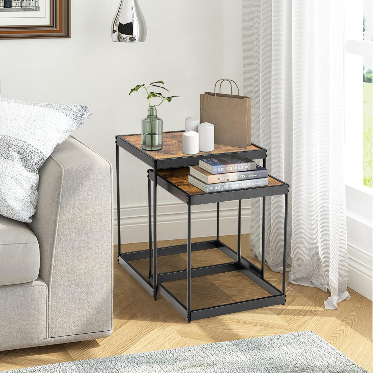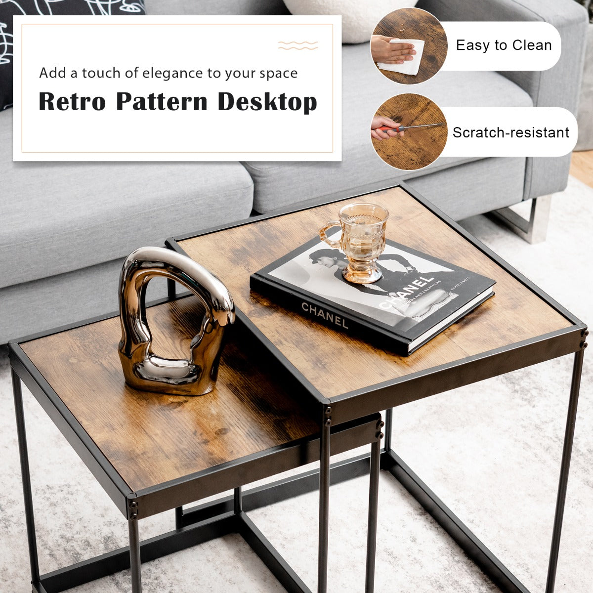 Retro Style & Multiple Scenes: Black steel tube frame and retro pattern desktop create an attractive look. With smooth and beautiful lines, the practical nesting table set with stylish design highlights your space. It can blend with various styles of decorations and furniture. You can put it in the living room, office, bedroom and anywhere you want.