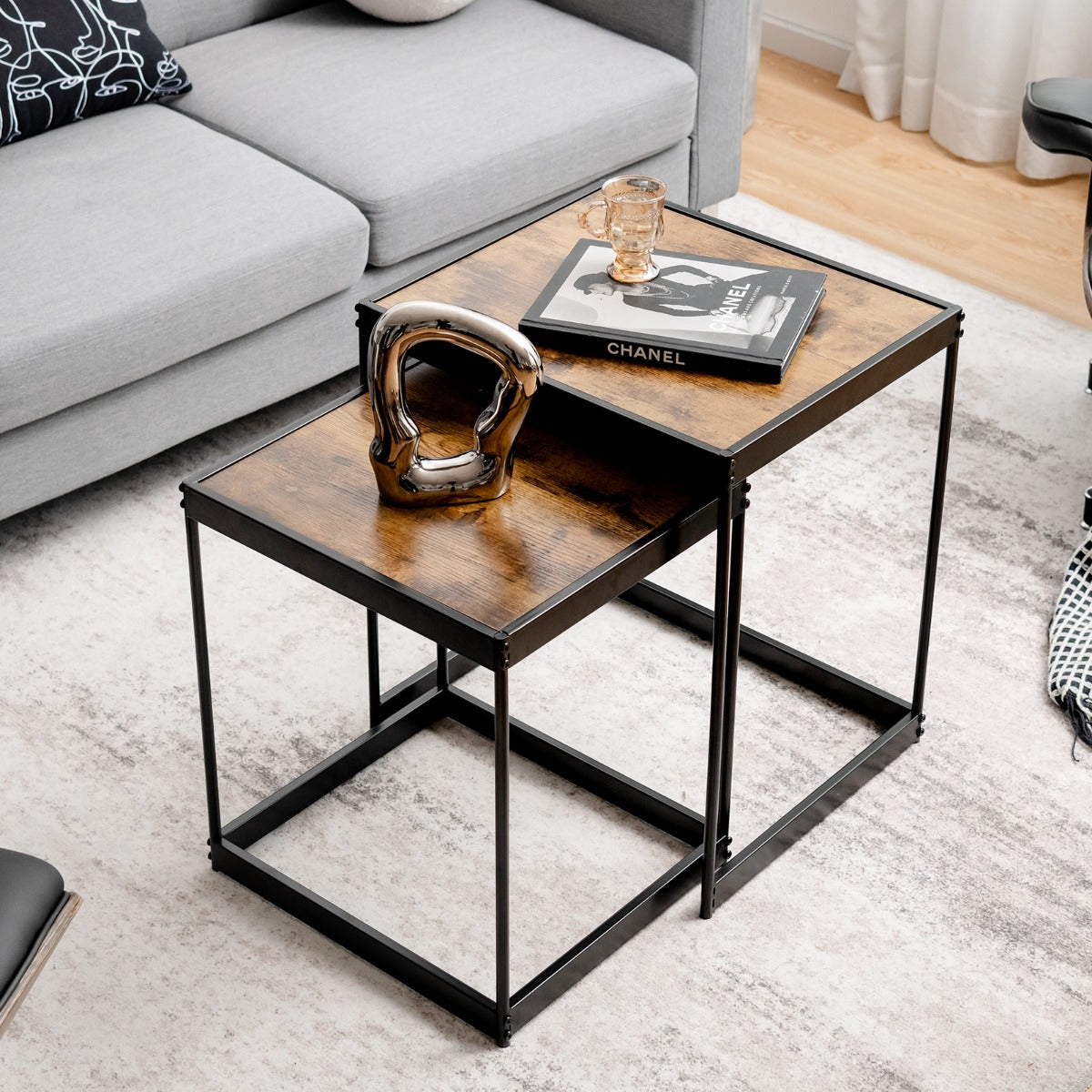 Are you looking for a nesting table with a retro look that can bring a touch of elegance to your living room or office? Our 2pcs square nesting tables is your ideal choice! This set of 2 coffee table can be used separately or together to create enough space for your teacup, magazines and decorations. You can push the small table under the large table for convenient storage when not in use. Constructed by superior MDF board and study steel frame, the side table perform wells in sturdiness and load-bearing for long time use. The non-slip foot pads make it more stable without shaking and protect the floor. Thanks to the waterproof surface, you can clean it with with a damp cloth easily. This elegant table with retro pattern design will be an aesthetically appealing piece of furniture for your space.