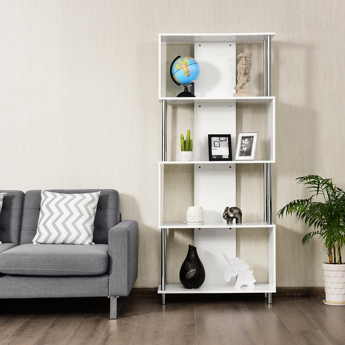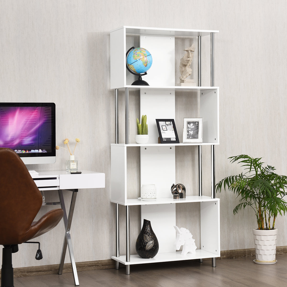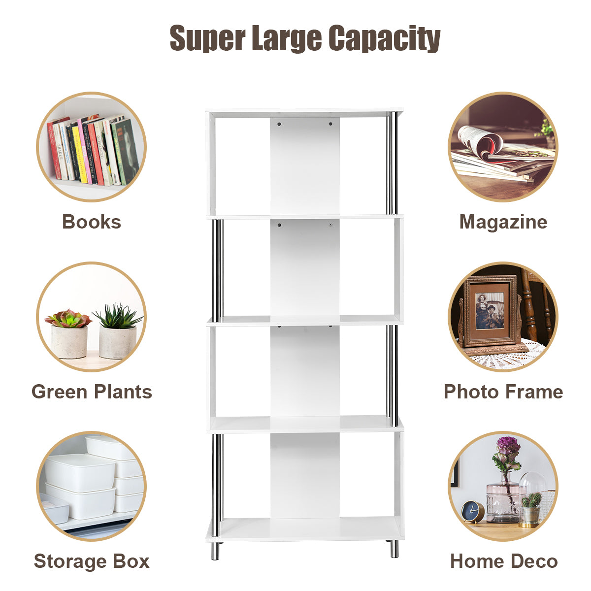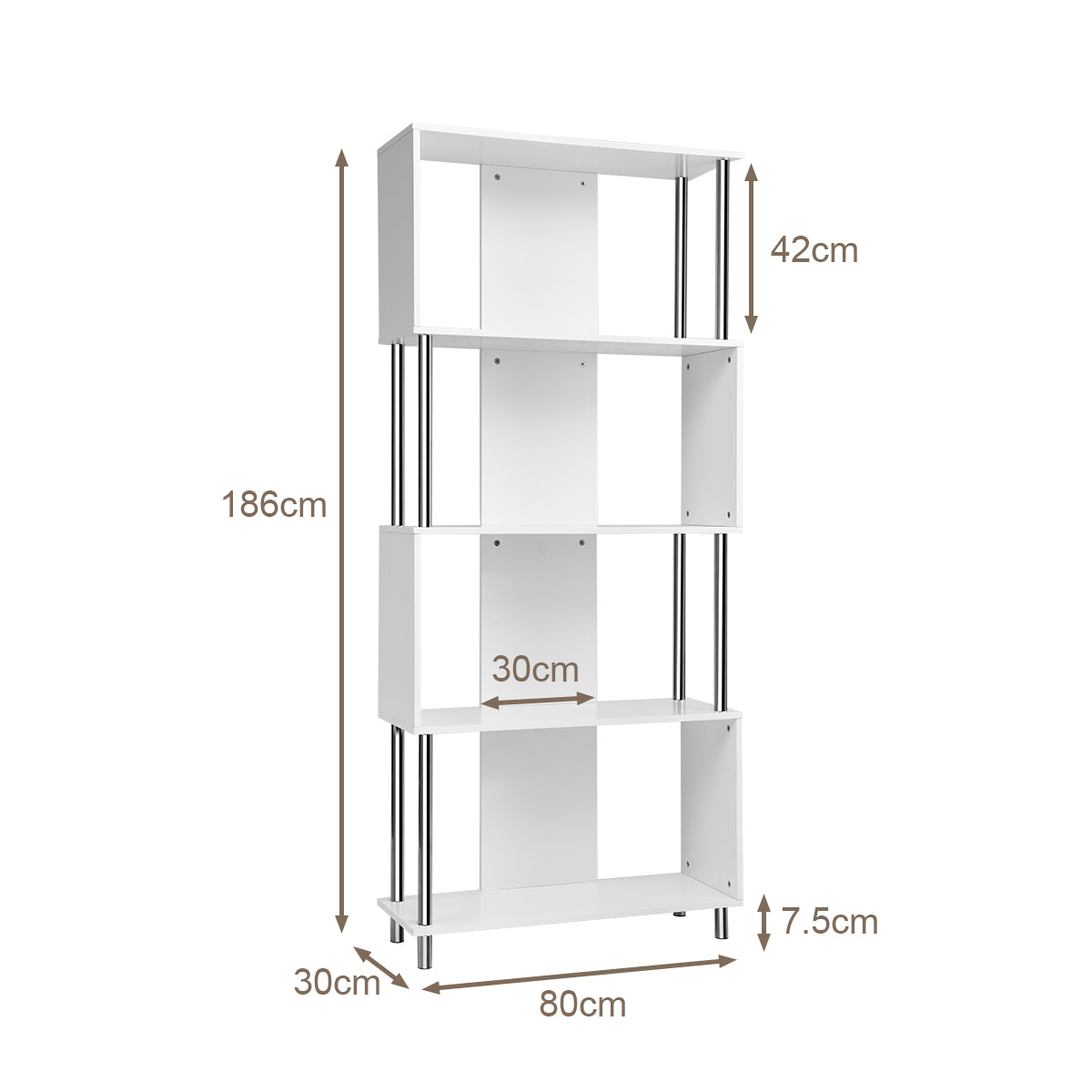 This attractive bookshelf combines wood and metal material artfully, show to an industrial character and artistic appeal feeling, pure white surface, the clean lines gives this bookcase a thoroughly modern fresh style. it meets the aesthetic of practicality and adds a lot of interest and particular charm to any room's interior. Snaking bookshelf with modern open concept design, four tiers large open shelf can display your books, CDs, DVDs, vases, photo frames, decorations and collectibles. It will be your best organizer to make your living room, bedroom, and office tidy, It is a good ornament that let your room full of fashion sense. Don't hesitate to buy it now!