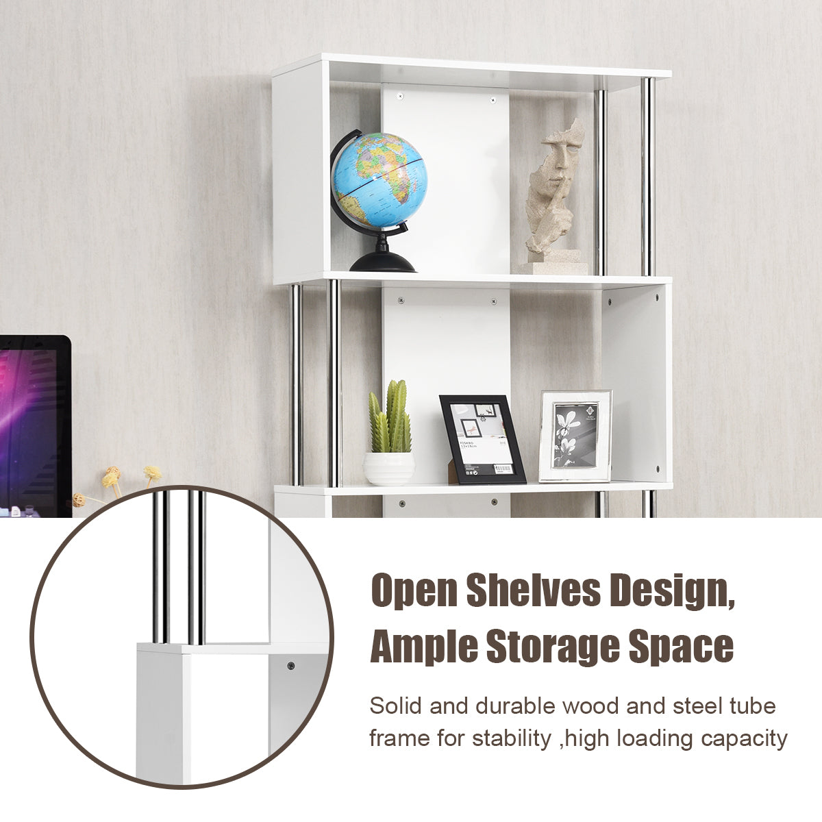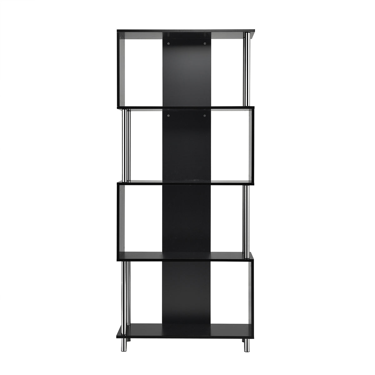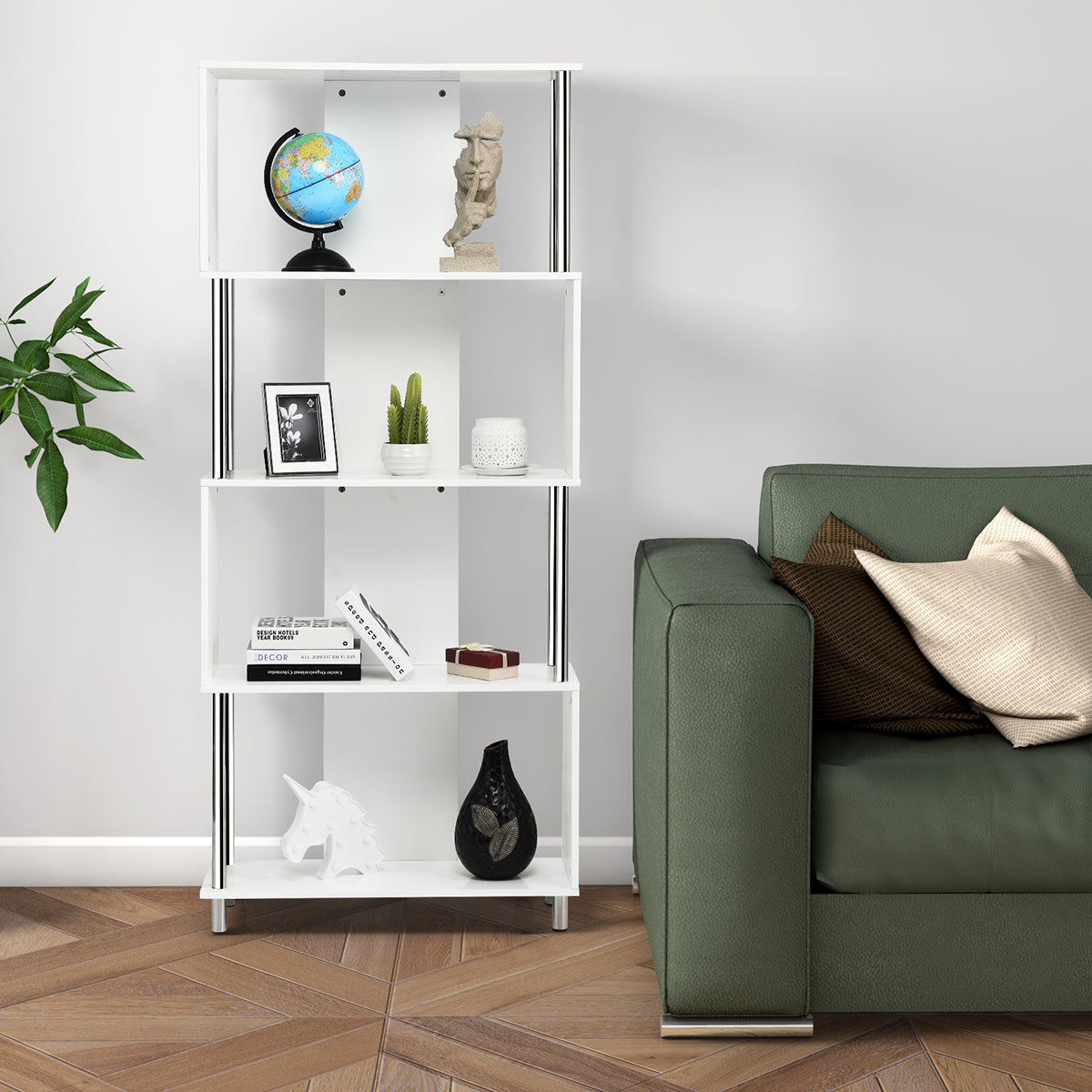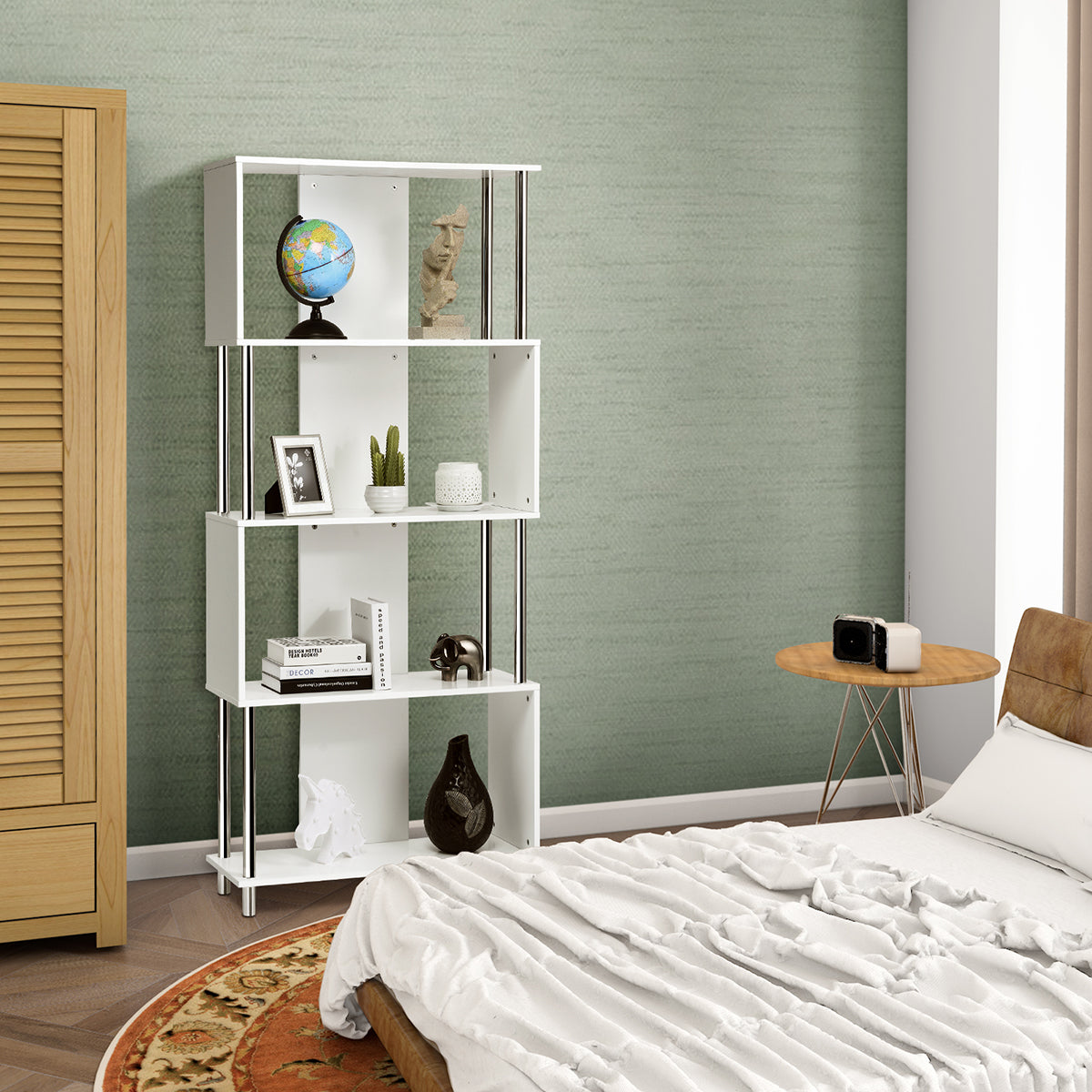 This attractive bookshelf combines wood and metal material artfully, show to an industrial character and artistic appeal feeling, pure white surface, the clean lines gives this bookcase a thoroughly modern fresh style. it meets the aesthetic of practicality and adds a lot of interest and particular charm to any room's interior. Snaking bookshelf with modern open concept design, four tiers large open shelf can display your books, CDs, DVDs, vases, photo frames, decorations and collectibles. It will be your best organizer to make your living room, bedroom, and office tidy, It is a good ornament that let your room full of fashion sense. Don't hesitate to buy it now!