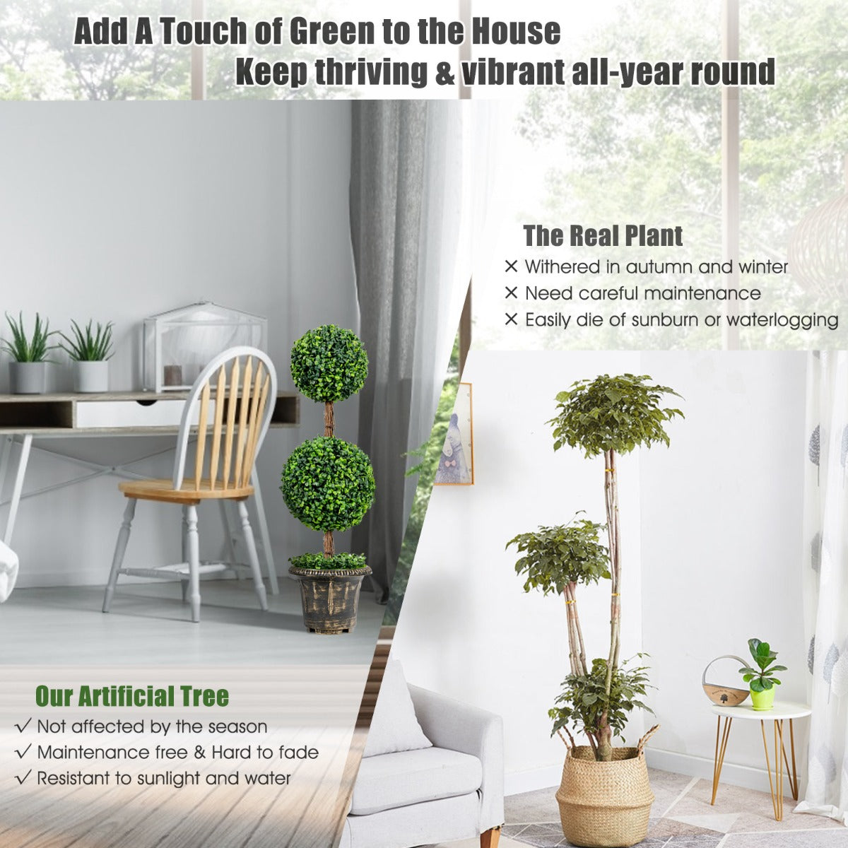 Lifelike and realistic like a real one, the artificial tree comes with PE leaves to present the natural texture and vivid color. More, the real wood rattan delivers the natural touch and leaves with the appearance of real plants. Selected PE material allows for long-term use, which is also non-toxic and odorless for the whole family. Supported by the sturdy iron tube, the artificial tree is hard to deform during use. And the pot on the bottom is filled with cement to enhance stability, avoiding slipping or falling. For outdoor and indoor use, the plant is resistant to UV and water. You can freely place it at the entrance, balcony, garden and more. This artificial tree is certain to exceed your expectations.