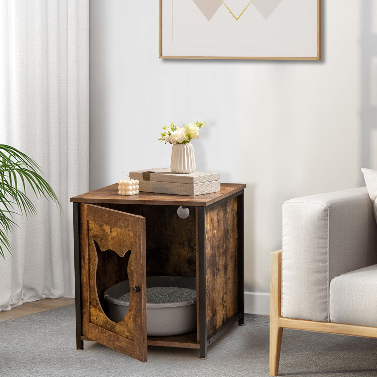 A Private & Warm House for Your Lovely Cat! Our cat litter box enclosure measures 50cm x 53cm x 55cm (L x W x H) and the interior measures 40.5cm x 51cm x 48cm (L x W x H), which fits most common litter boxes (Notice: Pleasure the size of your cat litter box before purchase). The industrial cat house can not only allow your cat to find a sense of security and belongings in a comfortable area but also can be a perfect addition to your home decor. More than that, the hidden cat washroom can also be used as a nightstand, end table, coffee table, storage cabinet, or cat house. The supporting frame is constructed of high-strength powder-coated metal, which is rustproof and sturdy enough to ensure long-term use. You can also adjust the bottom footpads to fit the uneven floor, adding more stability. Besides, there exist 3 ventilated holes on the backboard for better air circulation, creating a safe and comfortable environment for your lovely kitten!