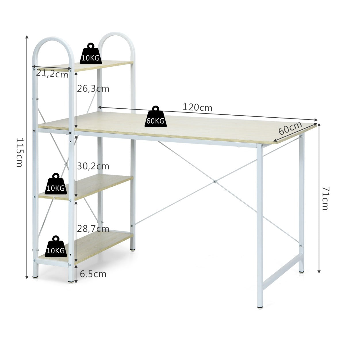 Designed with metal construction, the computer desk is excellent in sturdiness, which shows in the overall weight capacity of up to 90kg. The dimension of the desktop is 120 x 60 cm, which is spacious enough for a common computer and other items. On the side, there is a 4-tier open shelf where you can store many office supplies. As the shelf is reversible, you can freely place it in the right and left corners. Therefore, it is very suitable for small rooms.