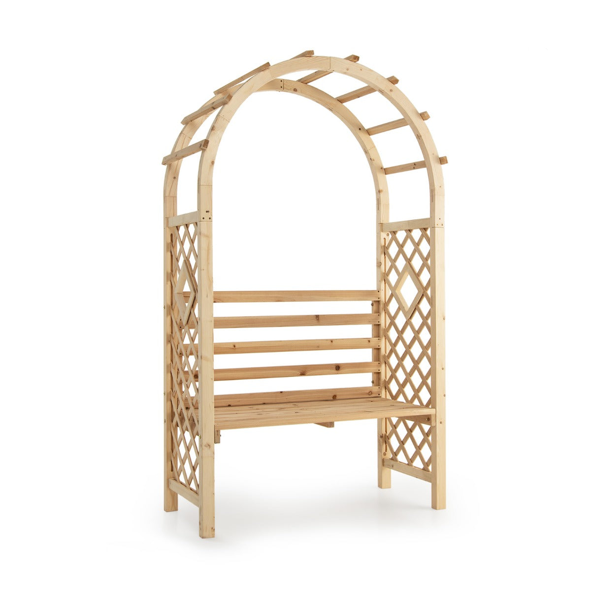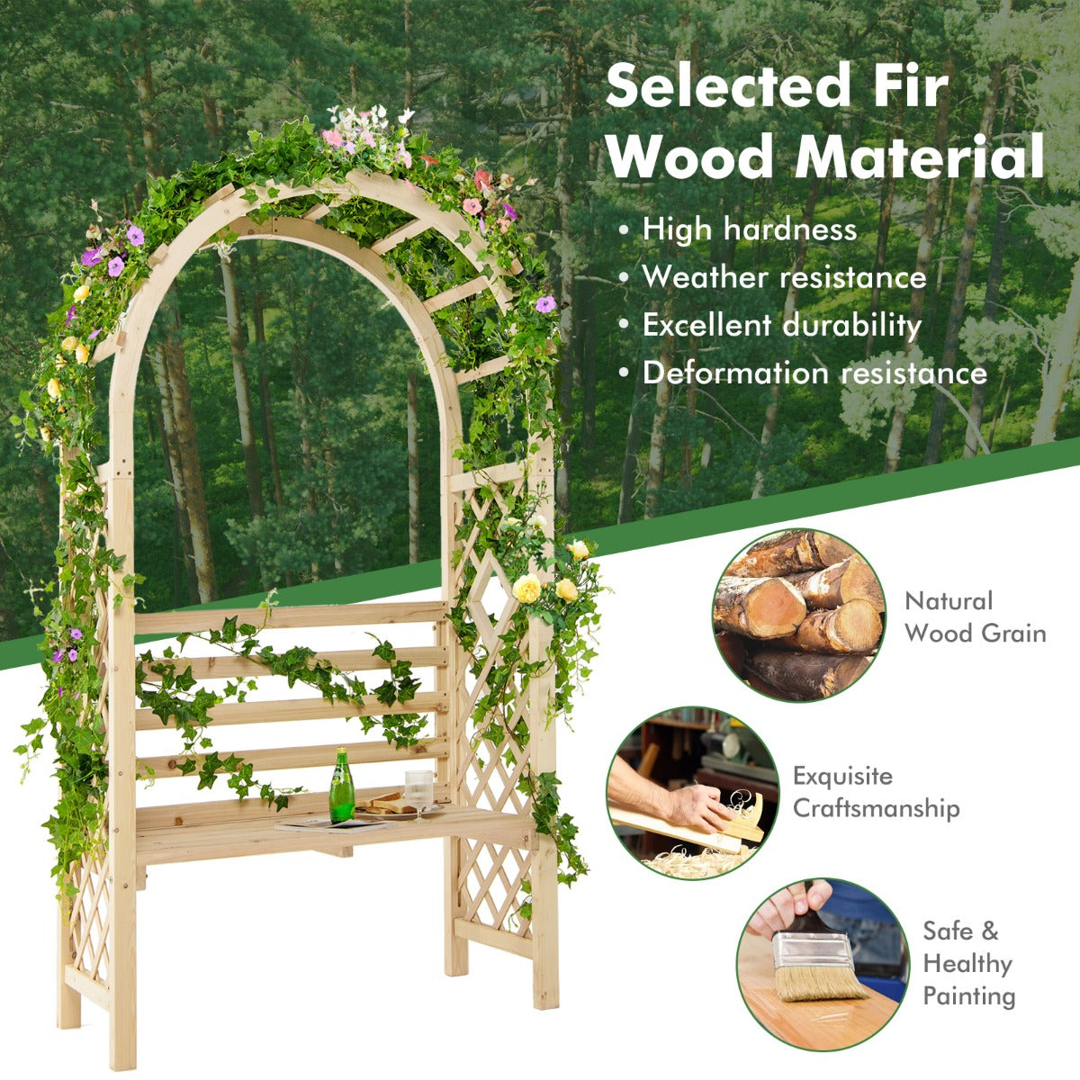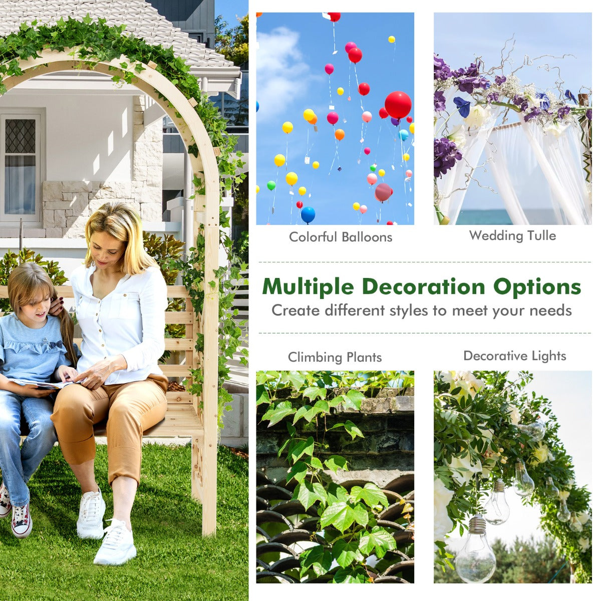 With a classic arch design and plant climbing trellis, the outdoor wooden pergola can be adorned with flowers, string lights, or balloons for weddings and other special events. Crafted from premium fir wood, it promises long-lasting service life. The extra-wide bench-style seating accommodates two people while providing additional space for a water bottle and other tools. This rustic garden arbor archway will be an aesthetically appealing piece of furniture in your space.