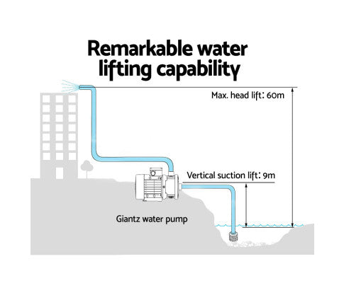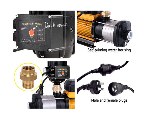 When low water pressure gets you down, power it up with our Giantz 6-stage Water Pump. It is the perfect solution where constant on-demand water pressure is needed at the open and close of any tap. You will find our water pump particularly useful for homes, household gardens, farms, commercial entities or any situation where pressurised water is consistently required. The water pump features an IP-rated commercial motor, full stainless steel pump body, cast iron ends, 1.25‘’ inlet and 1‘’ outlet ports, corrosion-resistant brass connectors, efficient cooling system and not least, built-in thermal protection. Pumping out at a rate of 200L/min with a 70m head, the 2500W water pump can send water up to two stories high effortlessly. You can also accurately control the pressure to your precise requirements with the fully automatic controller and monitor it at a glance of the pressure gauge. Power to the pump is as simple as plugging it straight into any Australian standard socket. Whether you are using the pump as a permanent installation or on an ad hoc basis, you can be assured of dependable and reliable water supply in more ways than one.