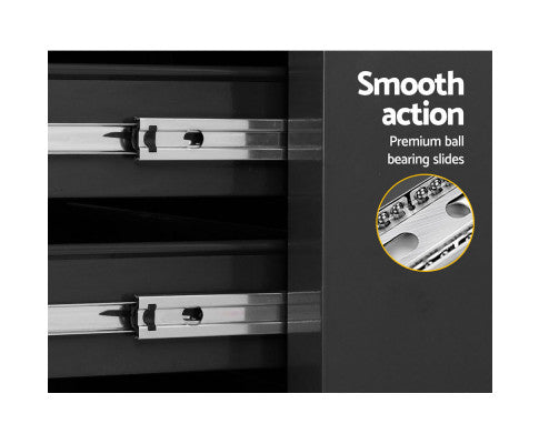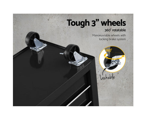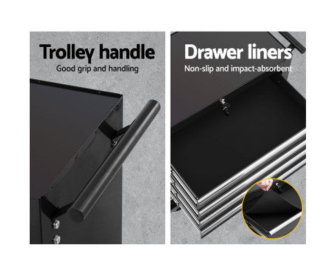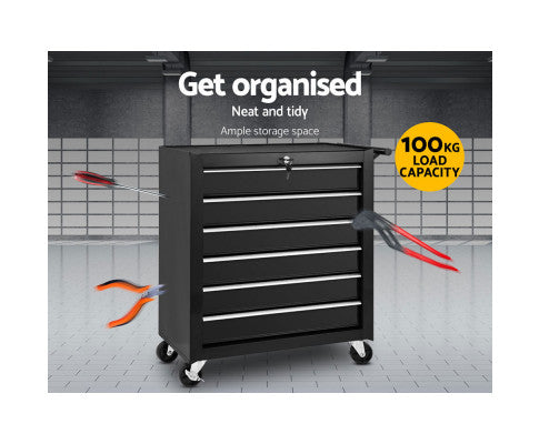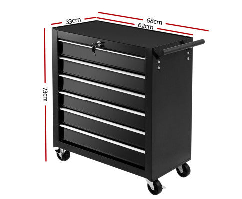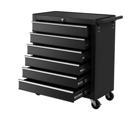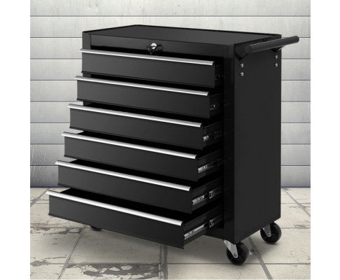 Made from powder-coated steel, our Giantz Tool Trolley is built to keep your precious tools in their proper place with six drawers that are specifically designed to cater to various tool sizes. From top to bottom, each drawer slides in and out effortlessly on quality ball bearings incorporated into the metal drawer runners. Every drawer is lined to protect your tools and keep them from moving about. The top of the trolley also features an impact-absorbent gripped surface for use with frequently handled tools. Plus, the drawers are installed with upgraded cam locks for added security. The trolley is installed with omni-directional castor wheels (two with brakes) for easy all-round mobility and fast standing. Not least, the trolley has a robust handle that provides full grip and smooth handling.